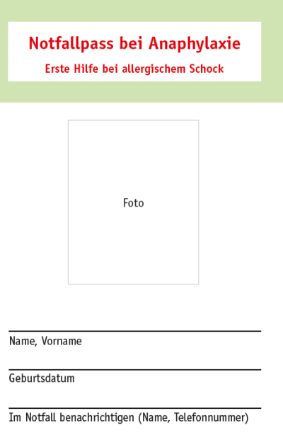 Der Anaphylaxie-Pass wird vom Arzt ausgestellt. Er enthält neben dem Nachweis Ihres Anaphylaxie-Auslösers auch eine Handlungsanweisung für den Notfall. Der Arzt trägt die verordneten Medikamente ein. Auch kann ein Aufkleber in den Pass geklebt werden, der die genaue Anwendung Ihres Adrenalin-Autoinjektors schrittweise darstellt. Den Notfallpass erhalten Sie als Mitglied beim DAAB unter info[at]daab[dot]de Führen Sie den Anaphylaxie-Pass immer in Verbindung mit Ihrem Notfallset mit sich!